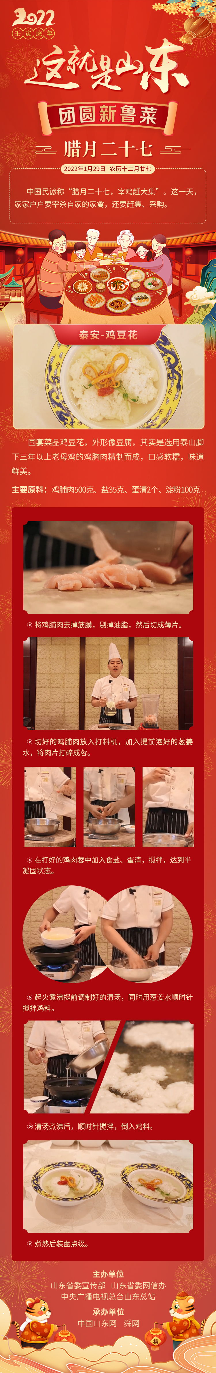 為充分展現(xiàn)新時(shí)代山東良好形象,持續(xù)擴(kuò)大“新時(shí)代 新魯菜”大賽的美譽(yù)度影響力,山東省委宣傳部、山東省委網(wǎng)信辦、中央廣播電視總臺(tái)山東總站主辦,中國(guó)山東網(wǎng)、舜網(wǎng)承辦“這就是山東·團(tuán)圓新魯菜”系列網(wǎng)絡(luò)主題宣傳活動(dòng)。在2022年春節(jié)期間(農(nóng)歷小年至正月十五),推出系列創(chuàng)意新魯菜,集中展示新時(shí)代齊魯飲食新風(fēng)尚。