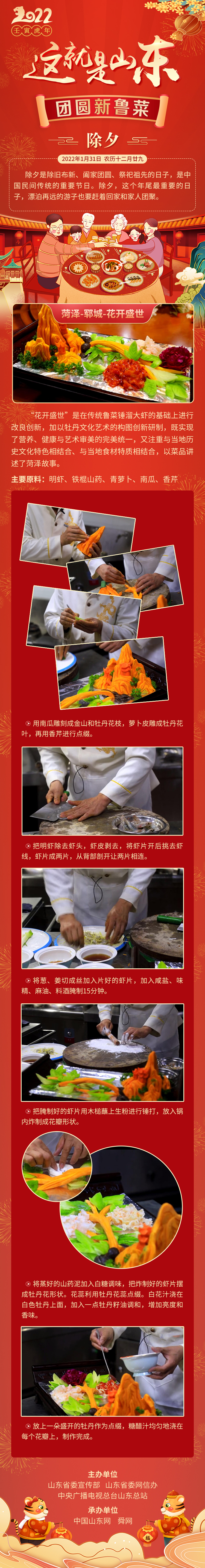 為充分展現新時代山東良好形象,持續擴大“新時代 新魯菜”大賽的美譽度影響力,山東省委宣傳部、山東省委網信辦、中央廣播電視總臺山東總站主辦,中國山東網、舜網承辦“這就是山東·團圓新魯菜”系列網絡主題宣傳活動。在2022年春節期間(農歷小年至正月十五),推出系列創意新魯菜,集中展示新時代齊魯飲食新風尚。