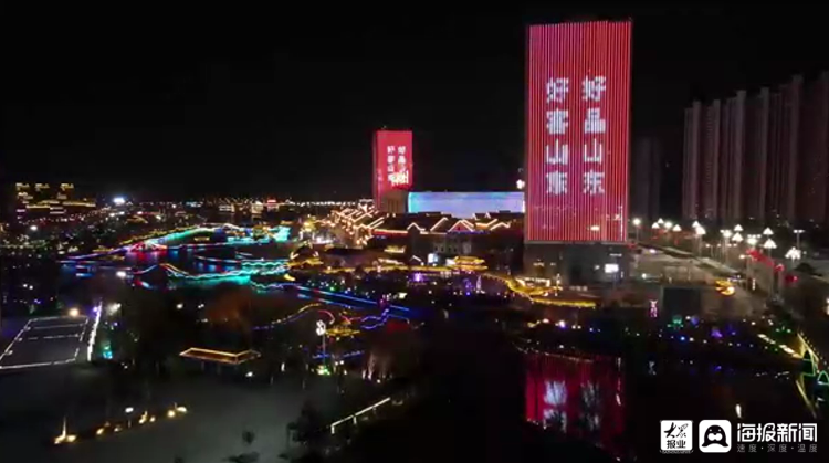 聊城城市地標點亮“好品山東”主題燈光秀。