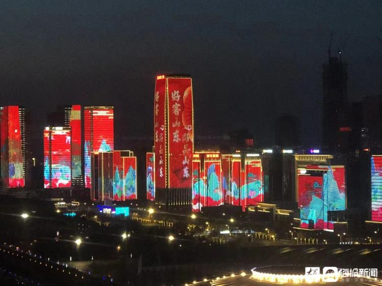濟南城市地標點亮“好品山東”主題燈光秀。