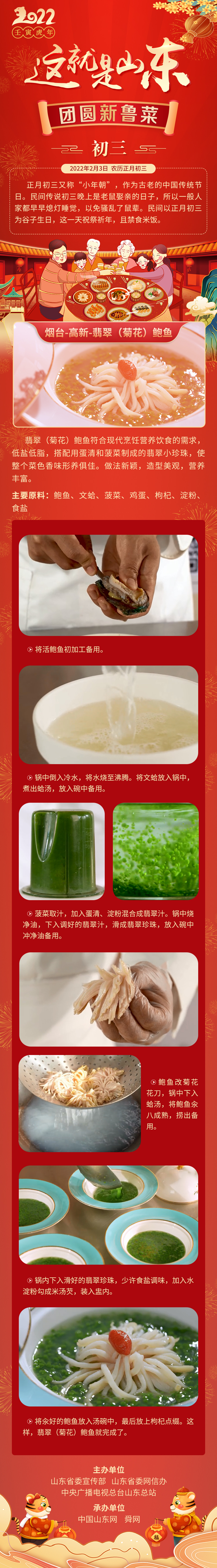 為充分展現新時代山東良好形象,持續擴大“新時代 新魯菜”大賽的美譽度影響力,山東省委宣傳部、山東省委網信辦、中央廣播電視總臺山東總站主辦,中國山東網、舜網承辦“這就是山東·團圓新魯菜”系列網絡主題宣傳活動。在2022年春節期間(農歷小年至正月十五),推出系列創意新魯菜,集中展示新時代齊魯飲食新風尚。