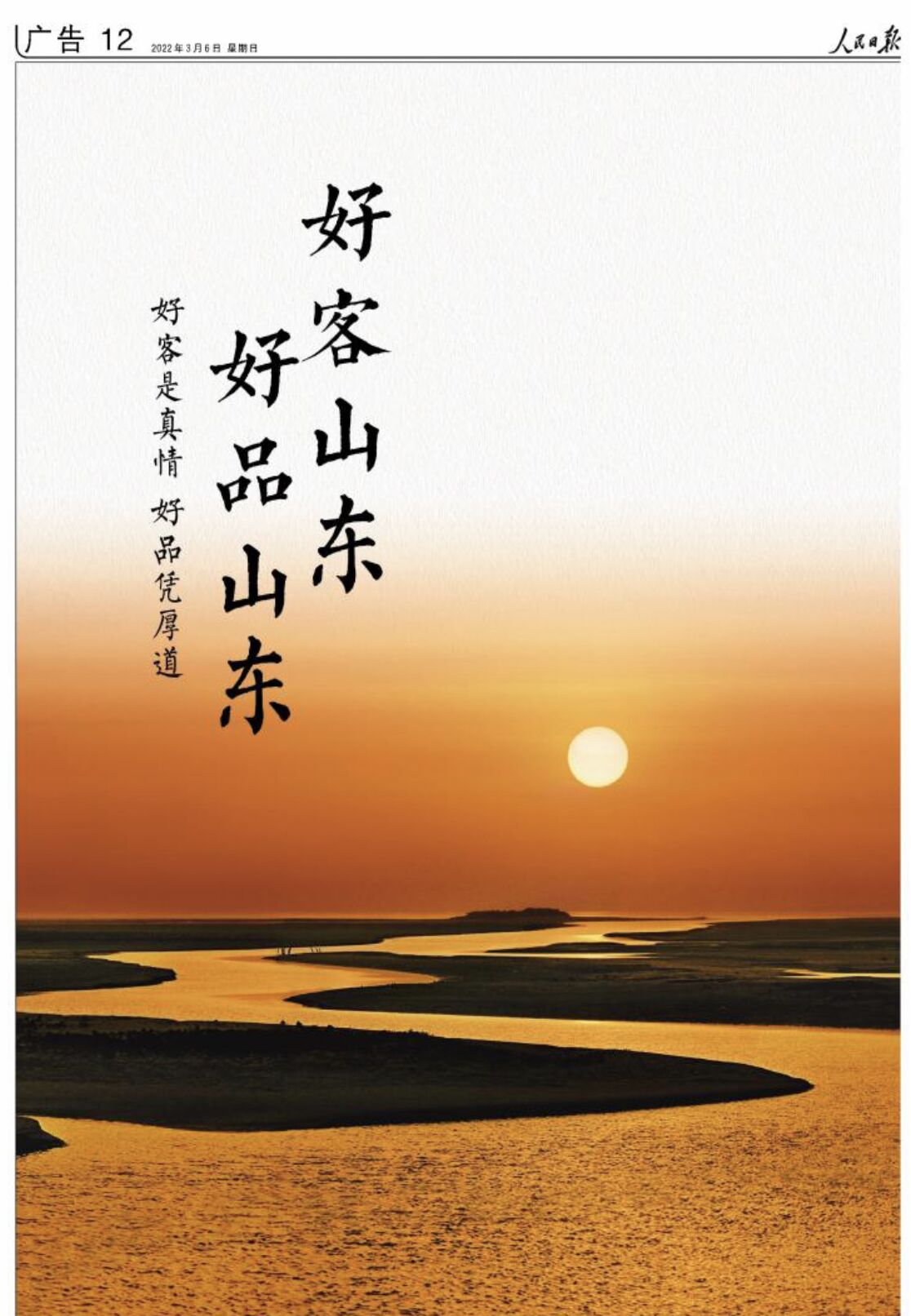 3月6日,人民日報整版推介“好客山東 好品山東”,為夯實、推出、叫響“好品山東”品牌強勢助力。海報整體格調精美大氣,以黃河上冉冉升起的太陽為底色,寓意山東未來良好的發展勢頭和廣闊的發展前景。“好客是真情,好品憑厚道”更是道出了打響山東品牌的初心與理念。