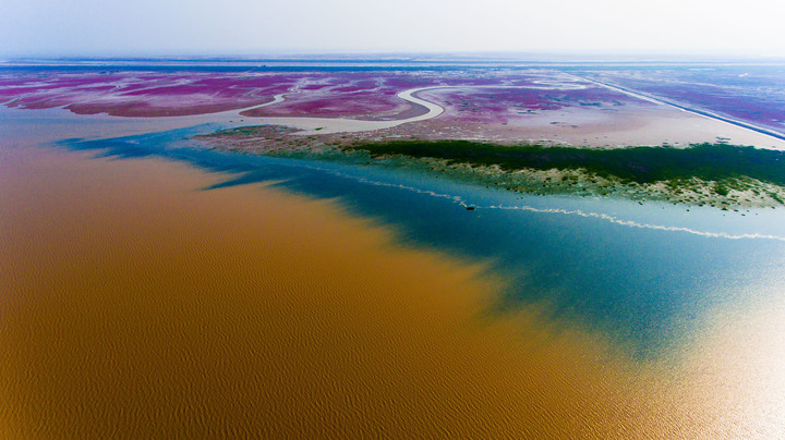 黃色的河水與湛藍的海水彼此推涌,于海浪翻滾中,兩種截然不同的顏色如此和諧地碰撞、擁抱而又瞬息分開。游船駛過,激起層層白色的浪花,鑲嵌在綿延數十公里的黃藍分界線上。向遠方眺望,海面猶如一張絲綢制成畫布,波紋起伏,流動著波瀾壯闊的自然之美。這一刻,黃河之浩蕩,渤海之磅礴,自然之偉力,濃縮于一張畫布之上,直抵人心。