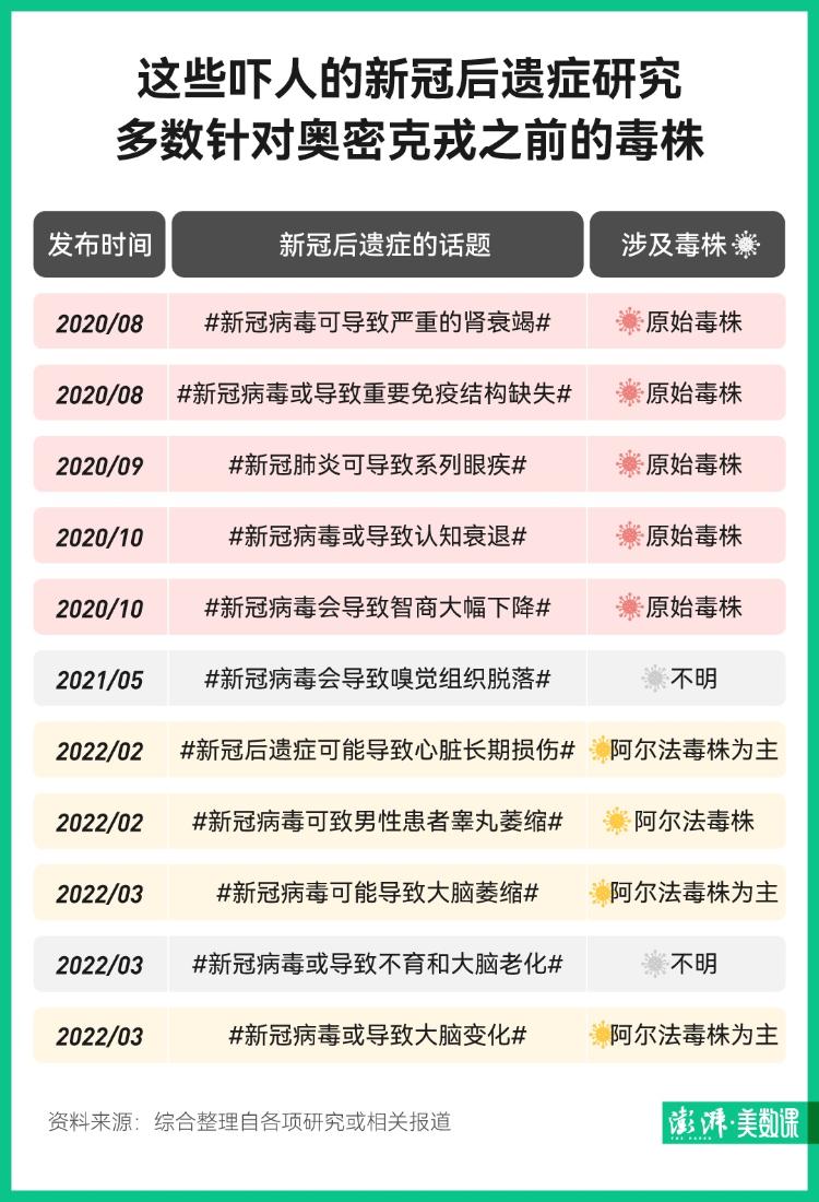 但需要強調的是,這些新冠后遺癥的研究,針對的是原始毒株、阿爾法毒株等早期新冠毒株,奧密克戎會帶來哪些后遺癥,還有待觀察。