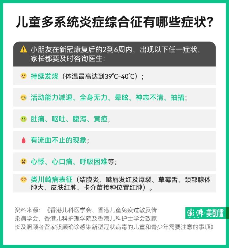 盡管大多數患有 MIS-C 的兒童在經過醫治后都會康復,但根據國外的情況看,還是有一些兒童的狀況會迅速惡化,以致危及生命。所以需要家長在孩子感染新冠后的 2 個月內,尤其注意這些情況: