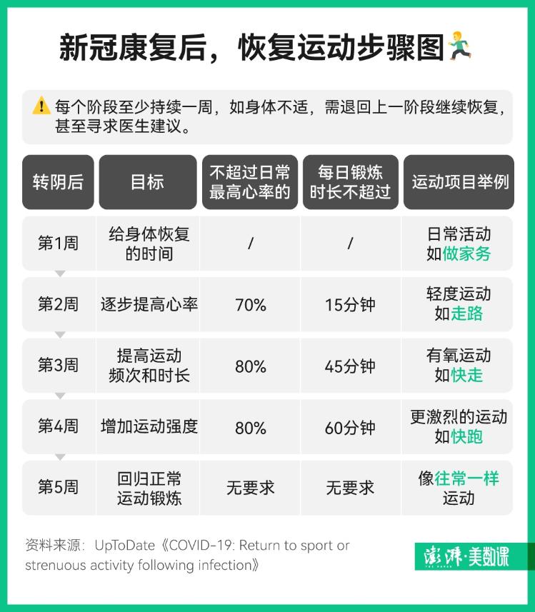 然后再花 7 天時間結合低強度運動,比如去散散步。在身體無任何不適的情況下,在下一周再將運動強度提高一個檔次。等轉陰一個月后,期間無任何不適后,再考慮將運動強度恢復到感染前的強度。