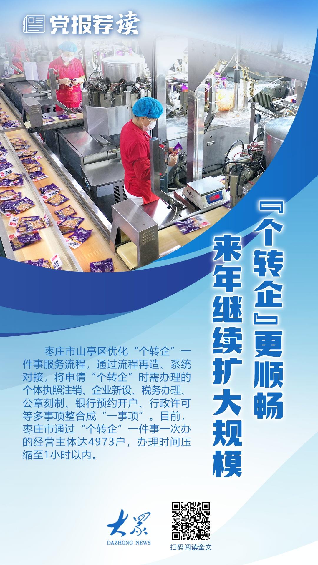 目前,棗莊市通過“個轉(zhuǎn)企”一件事一次辦的經(jīng)營主體達(dá)4973戶,辦理時間壓縮至1小時以內(nèi),辦理環(huán)節(jié)壓縮66%,高效助力個體工商戶轉(zhuǎn)型升級。