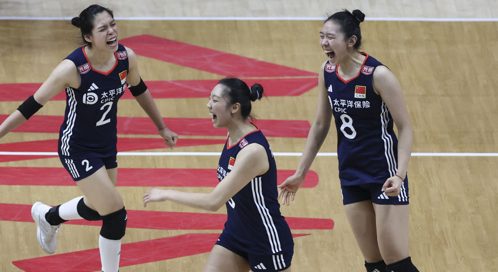 6月5日,中國隊球員莊宇珊、唐欣、萬梓玥(從左至右)在比賽中慶祝得分。新華社記者 韓巖 攝