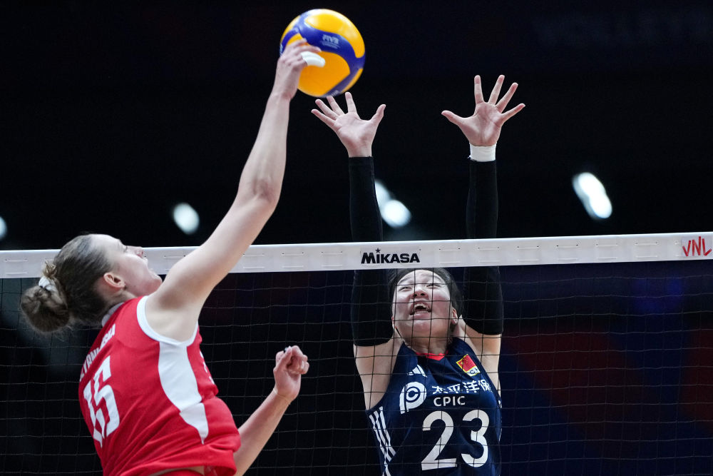 6月5日,中國隊球員張籽萱(右)在比賽中攔網(wǎng)。新華社記者 鞠煥宗 攝