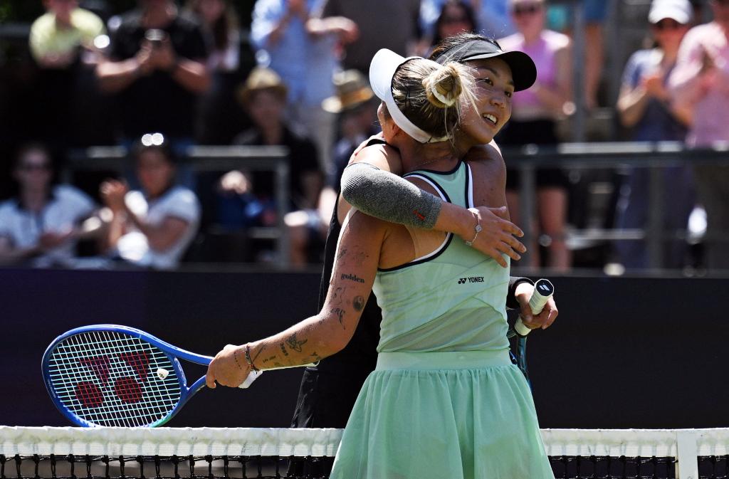 6月22日,王欣瑜(后)和萬卓索娃賽后擁抱。