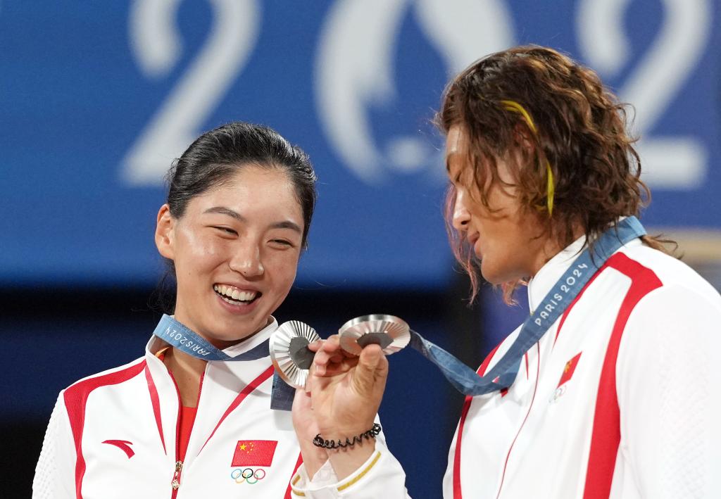 2024年8月2日,在巴黎奧運會網球混合雙打金牌賽中,中國組合王欣瑜/張之臻獲得銀牌。新華社記者 萬象 攝