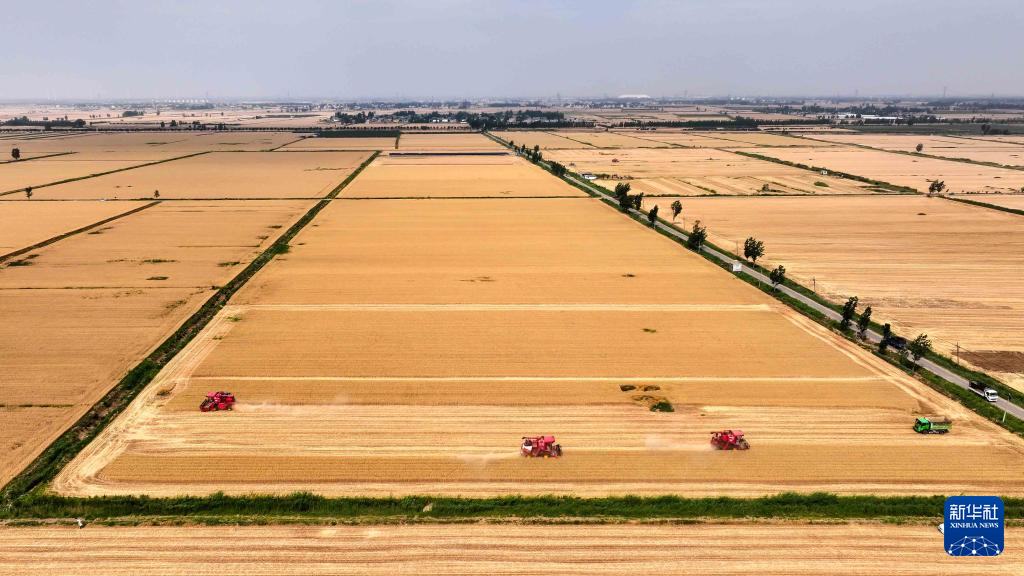 2025年6月5日,在嘉祥縣仲山鎮(zhèn),收割機(jī)在收獲小麥(無(wú)人機(jī)照片)。
