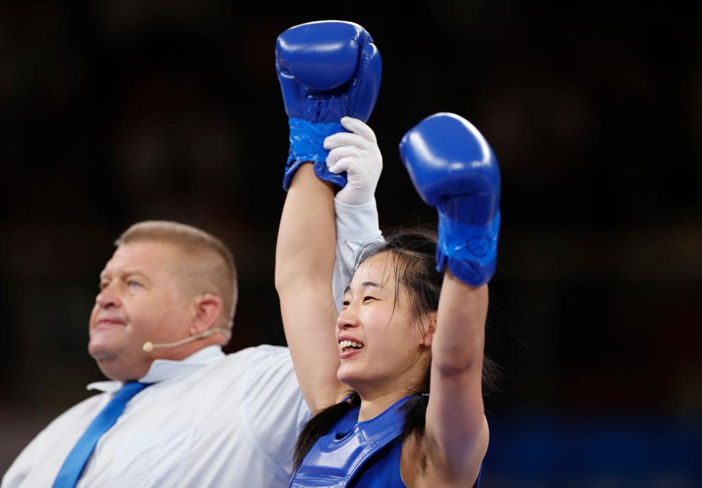2023年8月3日,中國散打選手李志勤(右)在成都大運會獲勝奪冠后慶祝。新華社記者 賈浩成 攝