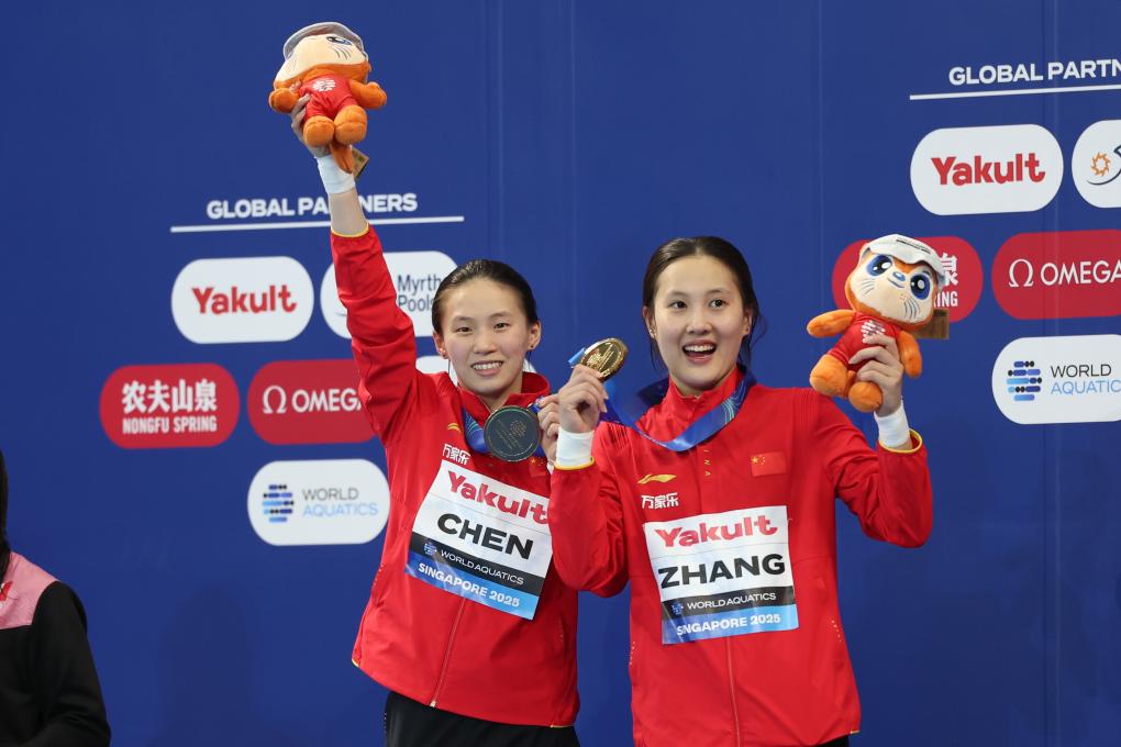 7月28日,陳芋汐/掌敏潔(右)在頒獎儀式上。新華社記者 雒圓 攝