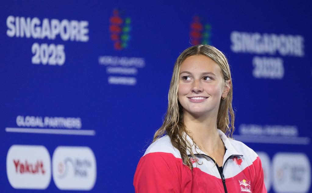 8月3日,2025年世界游泳錦標賽女子400米個人混合泳決賽在新加坡舉行。圖為冠軍加拿大選手麥金托什在頒獎儀式上。新華社記者雒圓攝