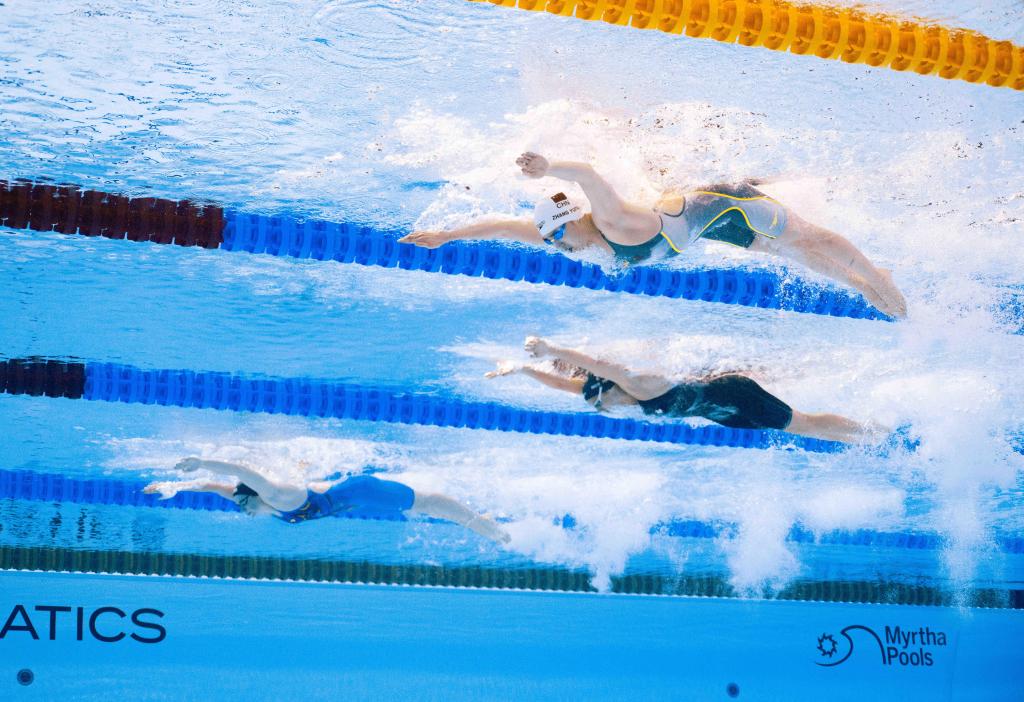 8月3日,中國隊第三棒選手張雨霏(上)在女子4×100米混合泳接力決賽中。新華社記者 薛宇舸 攝