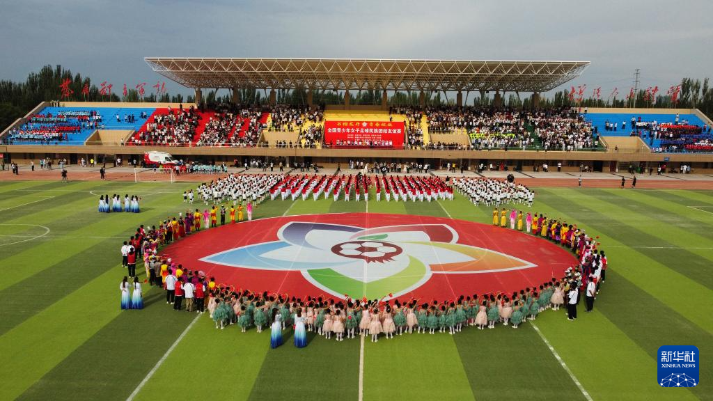 這是8月5日在新疆喀什市拍攝的全國青少年女子足球民族團結(jié)友誼賽開幕式現(xiàn)場(無人機照片)。