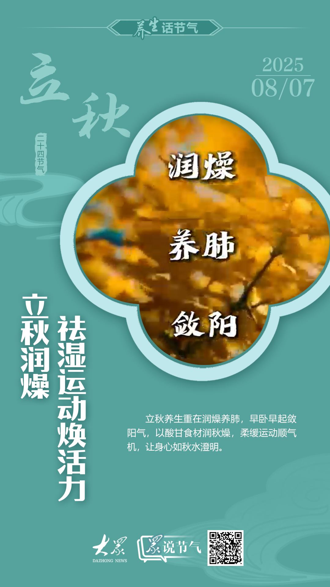 “云天收夏色,木葉動秋聲。”立秋將至,暑熱未消而秋涼漸起。作為夏秋之交的關(guān)鍵節(jié)氣,此時養(yǎng)生當(dāng)注重"潤燥、養(yǎng)肺、斂陽"三大原則。