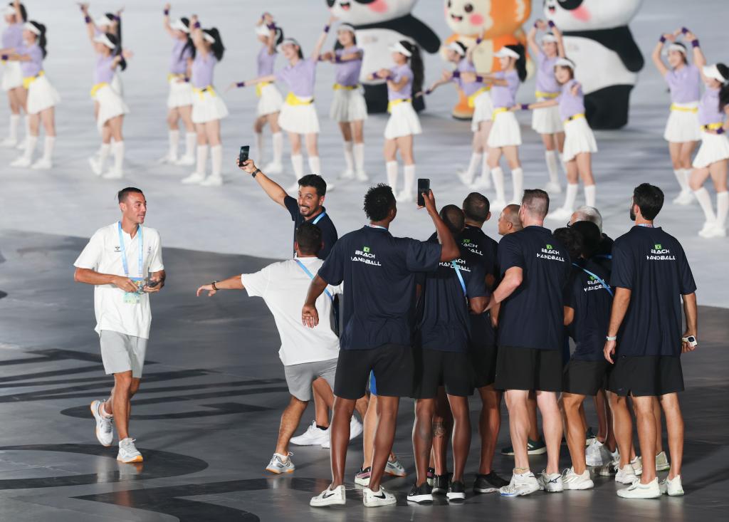 8月7日,巴西體育代表團(tuán)成員在開幕式現(xiàn)場自拍留念。 新華社記者 姜克紅 攝