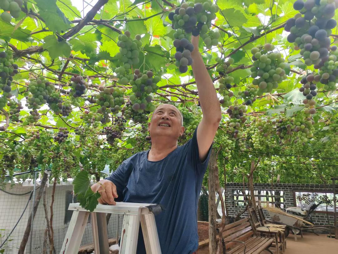 夏日升騰,陽光穿透層疊枝葉,棗莊市山亭區北莊鎮洪門村的葡萄架下響起沙沙聲。