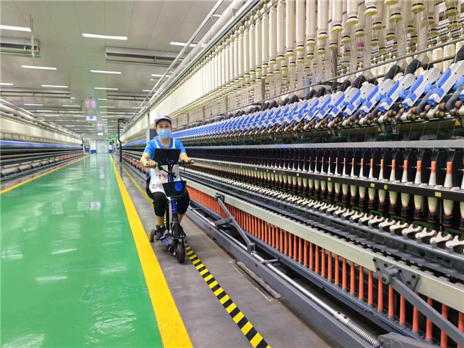 7月14日,山東魏橋創業集團的紡織車間內,一名女工正在巡查紡紗生產線。