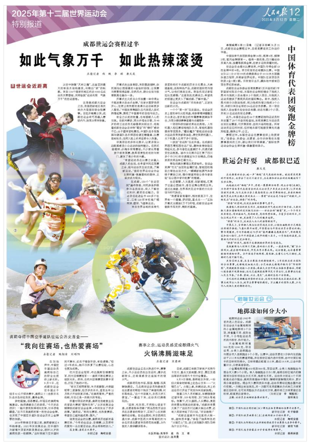 此起彼伏的“雄起”聲中,浮現一幕幕鮮活場景:觀眾合唱《成都》,為奪得中國體育代表團首金的武術運動員盧卓靈送去祝賀;72歲的英國拔河老將,與隊友協力登上最高領獎臺;體育舞蹈場邊,身姿優雅的裁判員成為觀眾鏡頭里的焦點……賽前“世運會是個啥會?”的提問,正轉變為“世運會,好耍!”的共鳴。