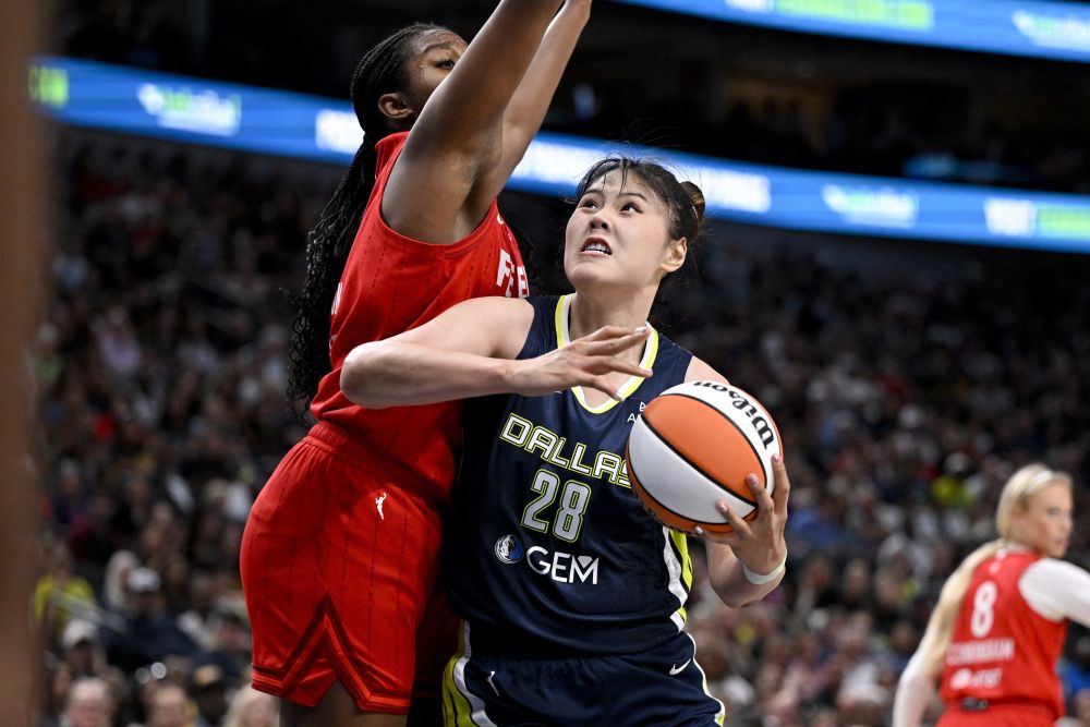 6月27日,達拉斯飛翼隊球員李月汝(前右)在2025賽季美國女子職業籃球聯賽(WNBA)常規賽中進攻。新華社/路透
