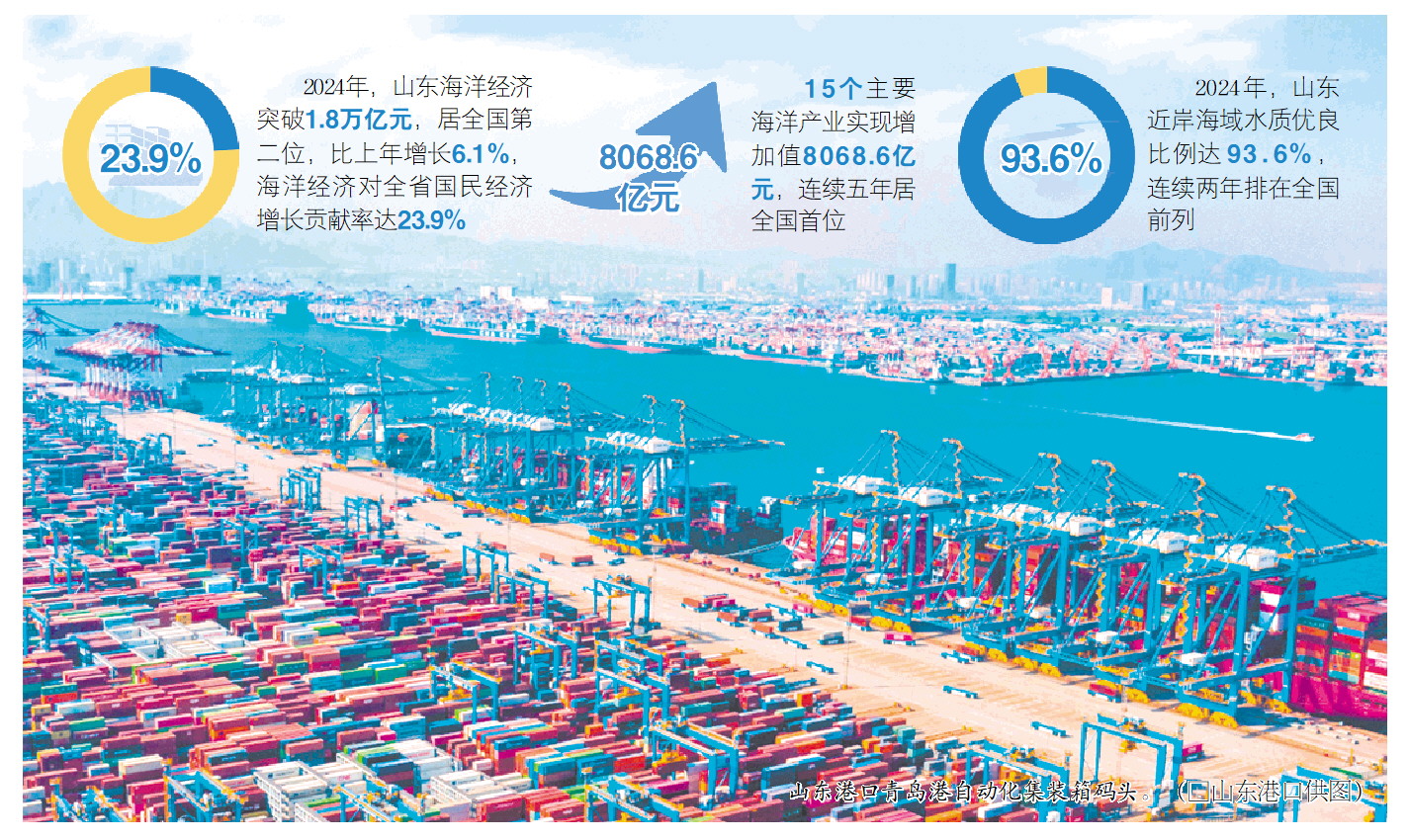 打造現代海洋經濟發展高地,既是習近平總書記的殷切期望,也是山東海洋強省建設的關鍵抓手。 看全球首艘15萬噸級智慧漁業大型養殖工船“國信1號2-1”,“船載艙養”大黃魚、鮭鱒魚等名優魚種,年產高品質魚類可達3600噸。傳統海洋漁業正在山東實現深度轉型與根基重塑。 看青島煉化氫能“產研加”示范園內,全國首個工廠化海水直接制氫科研項目,所產氫氣用于氫能車輛加注或摻入煉化生產過程。海洋經濟疊加山東雄厚的產業基礎、豐富的應用場景,潛力無限。 山東15個主要海洋產業中,傳統產業占11個。傳統并不代表“落后”,當傳統產業與新技術、新裝備深度結合,“耕海探洋”便有了更多新解法,引領產業向中高端躍升。與此同時,以海洋電力業、海洋工程裝備制造業、海洋藥物和生物制品業、海水淡化與綜合利用業為代表的新興產業加快成長,為山東海洋經濟注入活力。 嶗山實驗室實現規范化運行,國家深海基因庫、深海大數據中心和深海標本樣品館“深海三大國家平臺”簽署部省市共建協議,國家海洋綜合試驗場(威海)建設取得階段性成效……國家級創新平臺正成為“海上山東”吸引全球頂尖人才、賦能產業未來、產生原創性成果的核心策源地。 整合優化沿海港口資源,組建山東省港口集團,推動港口規劃“一盤棋”、資源開發“一張圖”、管理服務“一張網”,整體聯動效應顯現。2024年,山東沿海港口貨物吞吐量突破20億噸、連續3年居全國首位,集裝箱海鐵聯運量420萬標箱、連續10年居全國第一,不僅加速產業集聚、貿易往來和信息交匯,更成為山東接入全球經濟大網絡的開放樞紐和流量入口。 2024年,山東海洋經濟突破1.8萬億元,居全國第二位,比上年增長6.1%,海洋經濟對全省國民經濟增長貢獻率達23.9%。15個主要海洋產業實現增加值8068.6億元,連續五年居全國首位。