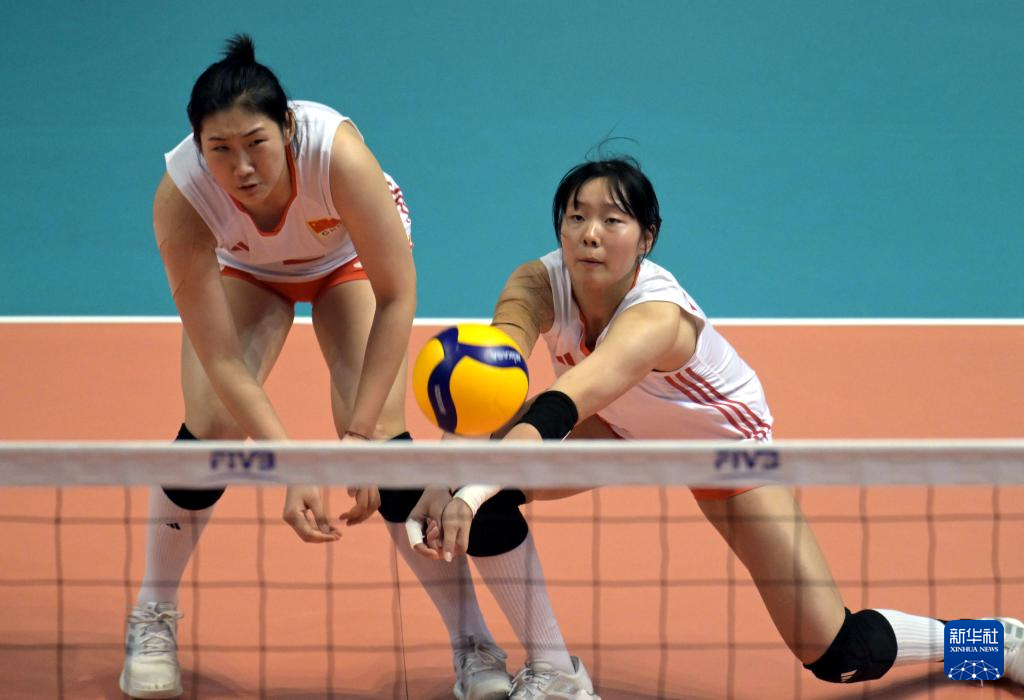 8月28日,中國隊球員黃怡維(右一)在比賽中扣球。新華社發(盧炳輝攝)