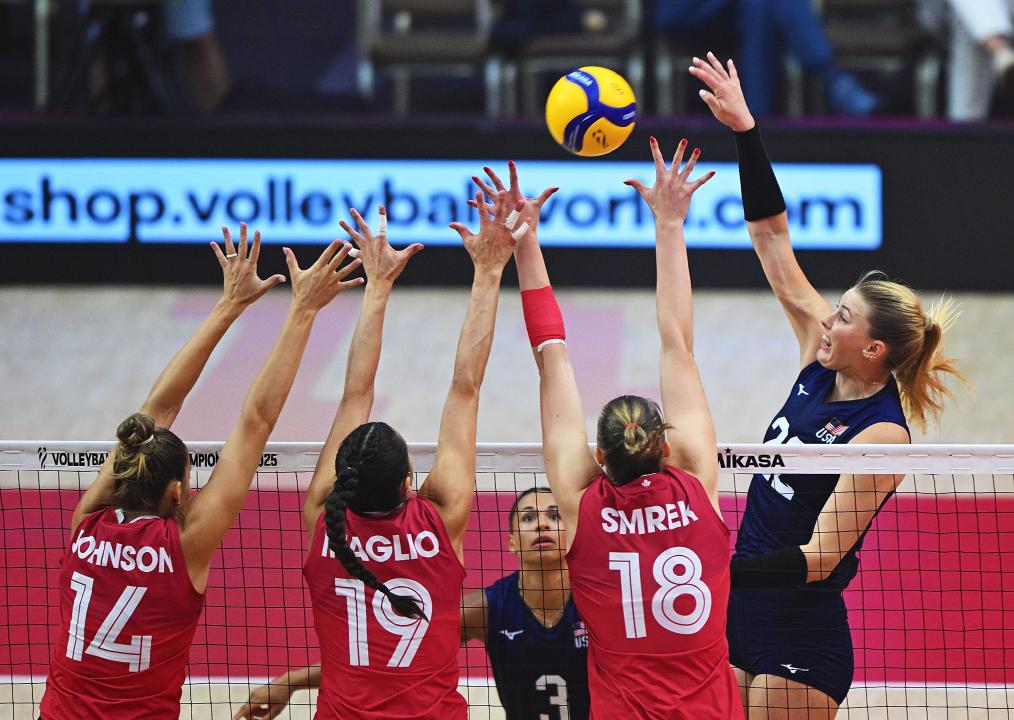 圖為美國隊球員在網前進攻。新華社記者 侯昭康 攝