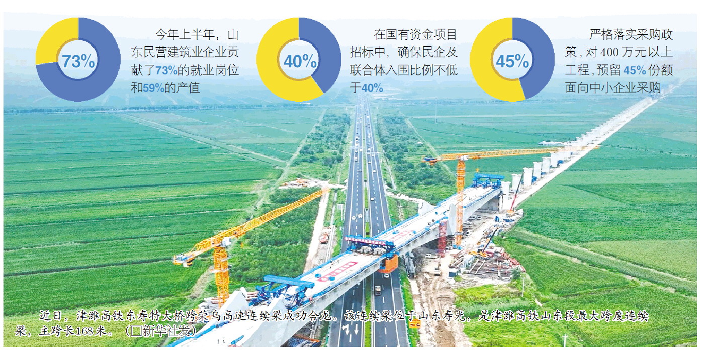 民營建筑業企業是山東建筑業的重要力量。今年上半年,全省民營建筑業企業貢獻了73%的就業崗位和59%的產值。