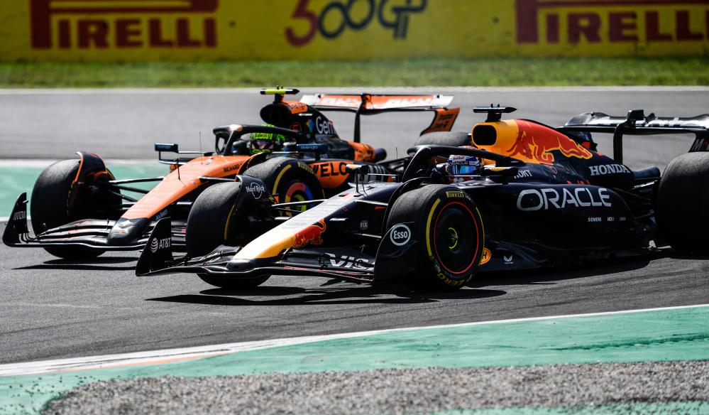 第四圈,維斯塔潘借助發(fā)車直道的尾流與DRS(減阻系統(tǒng)),在一號彎外線超越諾里斯,奪回領(lǐng)跑位置并迅速建立起領(lǐng)先優(yōu)勢。
