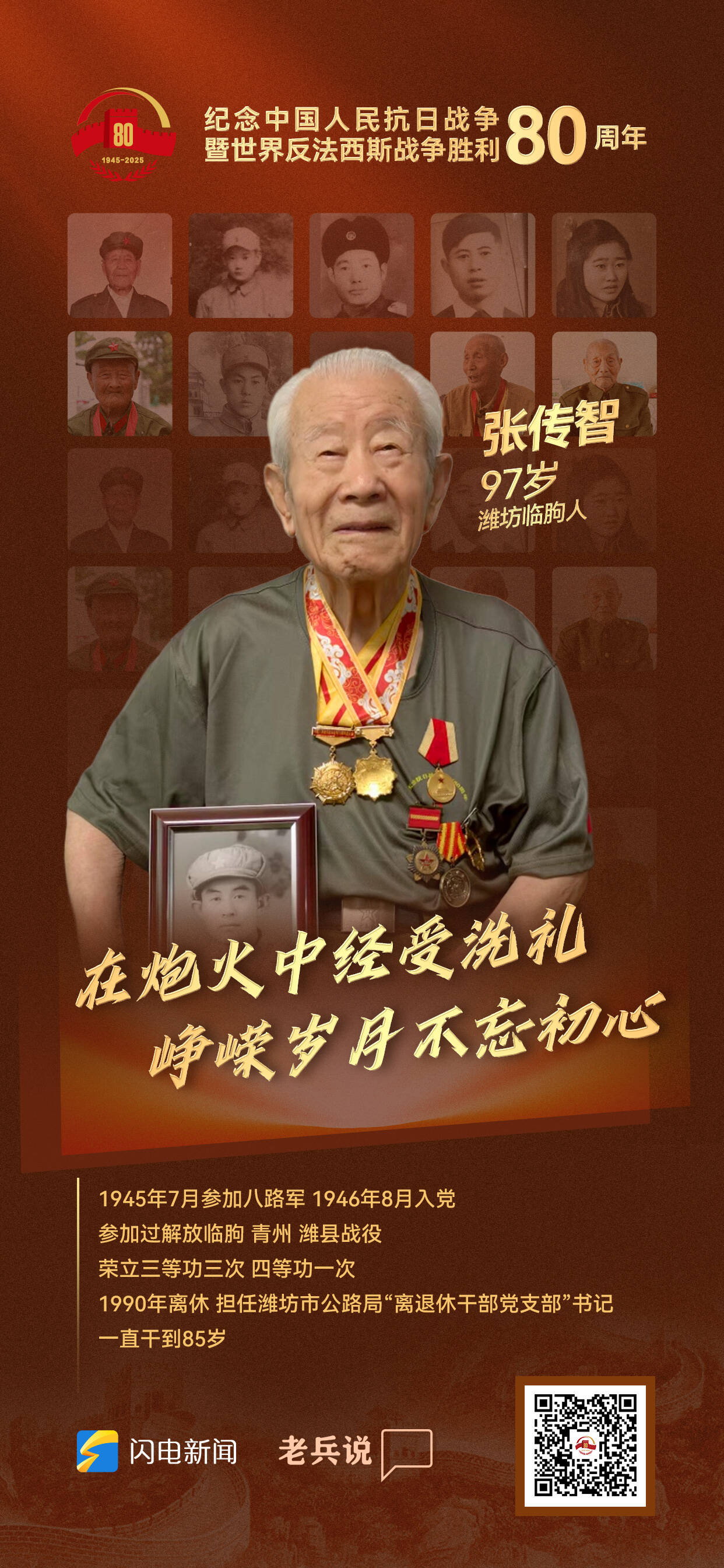 齊魯網·閃電新聞9月9日訊 為紀念中國人民抗日戰爭暨世界反法西斯戰爭勝利80周年,山東省委網信辦、山東省退役軍人事務廳、齊魯網·閃電新聞策劃推出“致敬!老兵”系列人物海報,今天走近“在炮火中經受洗禮,崢嶸歲月不忘初心——張傳智”。