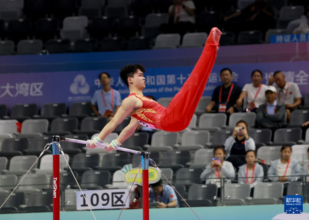 9月9日,廣西隊選手楊蘭斌在雙杠比賽中。最終,他獲得個人全能冠軍。