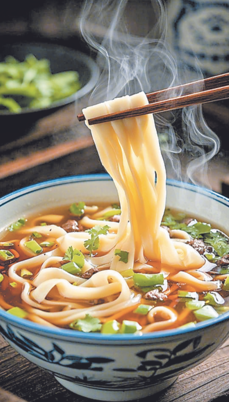 老板娘系著藍白格子圍裙從灶臺后探出身,鬢角的碎發沾著面粉,笑起來眉眼彎彎,像春日里剛融化的溪流。下單后不過片刻,一碗熱氣騰騰的面條便落在桌上。細白的面條臥在琥珀色的湯里,幾縷蔥絲浮在表面,看似尋常,可當筷子觸碰到面條的瞬間,我便察覺到了異樣——不同于機器壓制面條的光滑規整,這些面條帶著自然的紋理,入口時彈牙的觸感層層遞進,仿佛每一根都藏著故事。