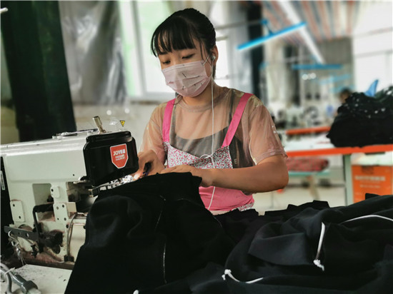 8月2日,在牡丹區小留鎮后劉莊村扶貧車間內,工人正在趕制戶外用品。為做好就業精準扶貧,全鎮30個扶貧車間主要加工服飾、鞋品、農副產品等,同時采取 “公司+生產車間+農戶”的生產模式,帶動1000多戶貧困戶就業增收。