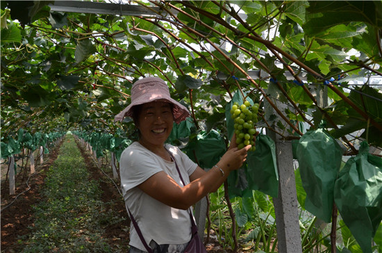 刁秀花告訴記者,她家有6口人,兩個孩子上學,全家的經濟來源依靠幾畝地,空閑時她和家人會通過打零工增加點收入,生活一直很拮據。以前考慮過干點啥,但干什么都需要本錢,投入成本和風險讓她一次次望而卻步。去年,省鄉村振興服務隊了解到她的情況后,為她鋪平了致富路,號召她種植陽光玫瑰葡萄,不需要她投入,免費為她建大棚、送技術、管銷售,她和家人按照技術員的指導只負責葡萄管理就行。10畝葡萄10個大棚,她省去了20萬元的投入費用,從種植到收果都有技術員上門指導,合作社負責銷售。她很珍惜這次機會,去年夏天種植葡萄后,全家人像伺候孩子一樣在葡萄地里施肥、掐尖、打叉、剪枝,一年四季,天一亮全家人就到葡萄園忙活。春天園里可種植早春菜,葡萄摘果后可以種植晚秋菜,現在套種的花生、毛芋頭等即將成熟,10畝大棚讓她的家庭收入翻了很多倍。