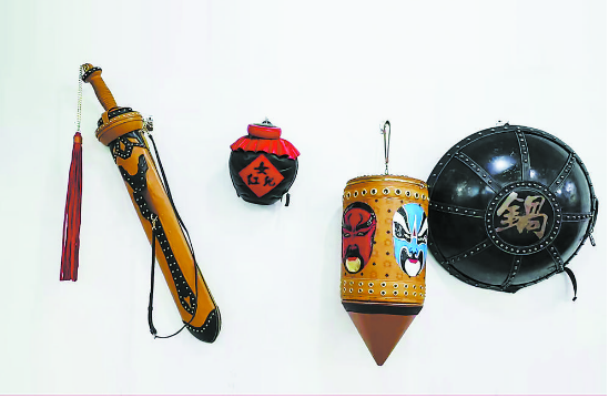 在展廳的北側(cè),墻上掛滿了他的皮質(zhì)工藝品,根據(jù)形狀,他把作品命名為屠龍刀包、鯉魚包、臉譜包……