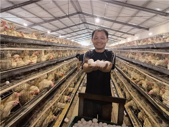 在村民孫自欣、孫自鵬兄弟倆的養殖場里,處于不同發育期的30000只雞被分養在3個棚里,并配有專門的降溫、喂水、喂飼料的設備。正值收雞蛋的時間段,兄弟倆在大棚里推著小車,不斷地彎腰,從架子上把雞蛋撿拾進筐子里。數量眾多、新鮮的白殼雞蛋擠擠挨挨,被一輛輛小推車運出棚外,令旁觀者都不由得想到了“豐收”。
