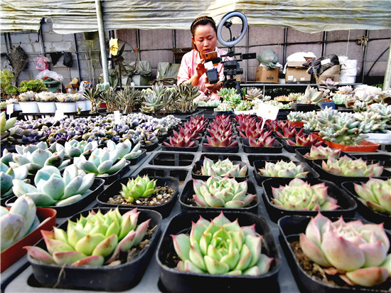 “現在俺村種植的多肉品種達到300多個,年產多肉100萬株,每年產值超百萬元。”姚顯坤介紹,現在依托直播銷售模式,他3個月的時間就賣出了1000多株多肉,收入近2萬元,不少村民放下鋤頭,拿起手機,當起了主播。