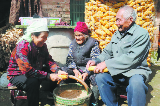 10月26日,當(dāng)筆者在定陶區(qū)張灣鎮(zhèn)張成寨村80歲老人張金秀的帶領(lǐng)下,來(lái)到牡丹區(qū)何樓街道崔寨村一個(gè)普通農(nóng)家小院的時(shí)候,現(xiàn)年70歲的農(nóng)家婦女張金足正和106歲的母親蔡氏,坐在整潔的院子里摳玉米粒。在她們身后,一個(gè)個(gè)金燦燦的玉米囤擺滿了院落。