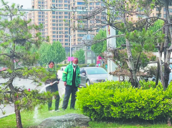 5月13日,市開發區園林工人在八一路附近給綠化苗木澆水。連日來,在我市城區街頭隨處可見園林工人忙碌的身影,他們或是清理綠地內的落葉雜草,或是修剪綠化帶過密的樹枝,或給綠化苗木澆水,給精致城區建設增色添彩的同時,讓廣大市民在鮮花翠綠中享受到美好時光。