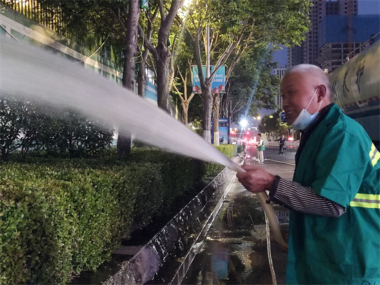 6月12日夜,市區和平路上,市開發區園林工人手持噴淋管忙著給綠植花卉澆水,用汗水澆灌城市綠蔭。連日的高溫,讓市區綠植連連“喊渴”,每到夜幕降臨,大部分人結束一天的勞作,園林綠化養護工人便開始對城區主干路、次干路的行道樹、綠地進行澆水、養護工作。園林工人介紹,夜間澆水,不僅能降低植物的蒸騰作用,更有效促進植物吸收,做好“補水”策略,利于綠化植物生長,同時還能避開人流的高峰期,為創城工作創造良好的條件。