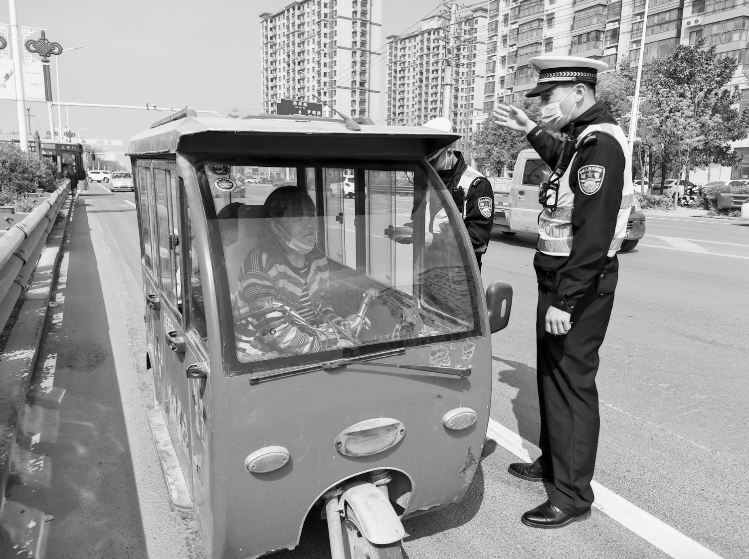 4月1日,東明縣站前路民警正在糾正違規行駛行為。為進一步規范交通秩序,改善城區道路通行環境,東明縣公安局交通警察大隊民警在城區主要路口持續行動,對電動三輪、四輪車違反規定通行以及涉牌涉證、闖紅燈、逆向行駛、非法載人等交通違法行為進行整治,引導群眾自覺做到遵守道路交通法律法規,安全文明出行,助力省級文明城市創建。