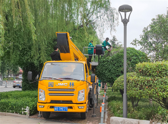5月9日,在市區新天地公園,魯西新區園林工人正在對步道兩側樹木進行集中整形修剪,提升道路“顏值”。