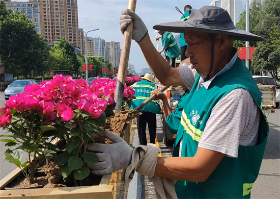 6月25日,魯西新區園林處的工人正在給人民路上原本單調的隔離欄加裝綠植花卉,長春花與三角梅被種植在護欄上的花箱內,風一吹過,花朵搖曳,遠遠看去猶如一幅擺放在路中的美麗油畫,使道路“顏值” 大幅提升。