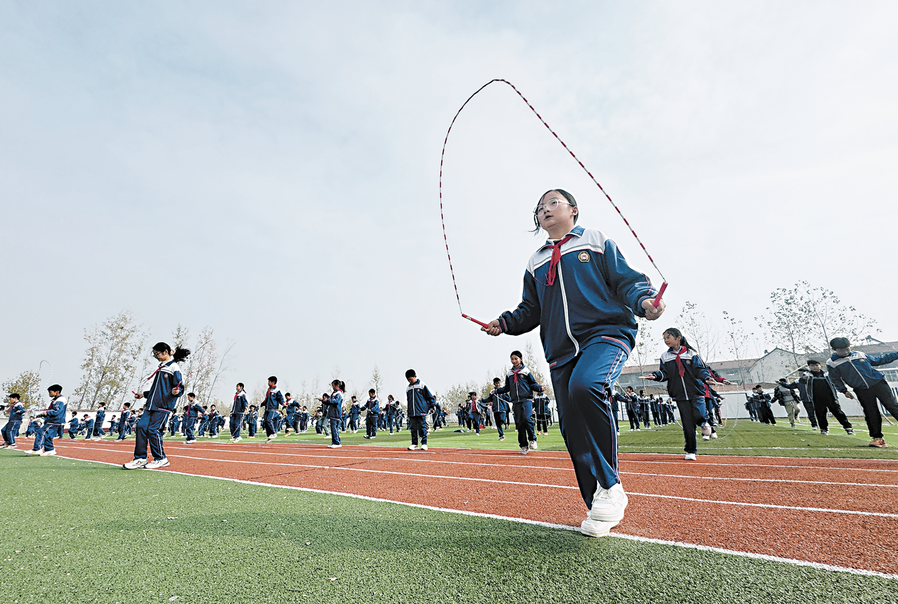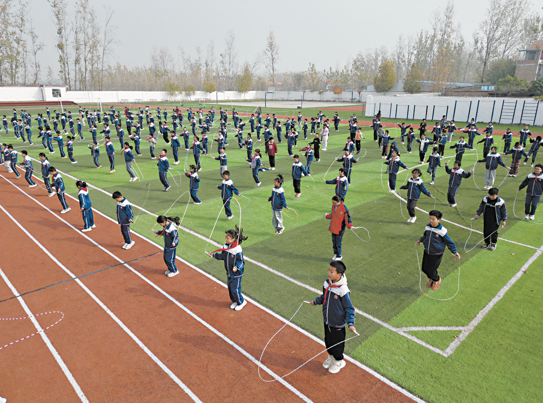 12月2日,在成武縣九女集鎮中心學校,學生們齊聚操場,共同跳起花樣跳繩。