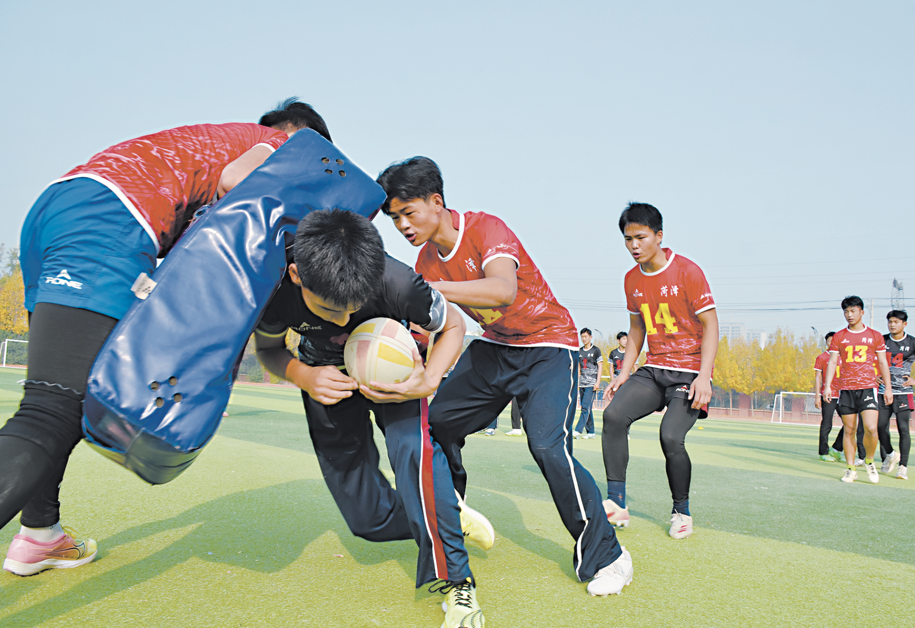 ▲12月2日,成武縣第一中學的同學們在練習橄欖球項目中的撞擊動作。