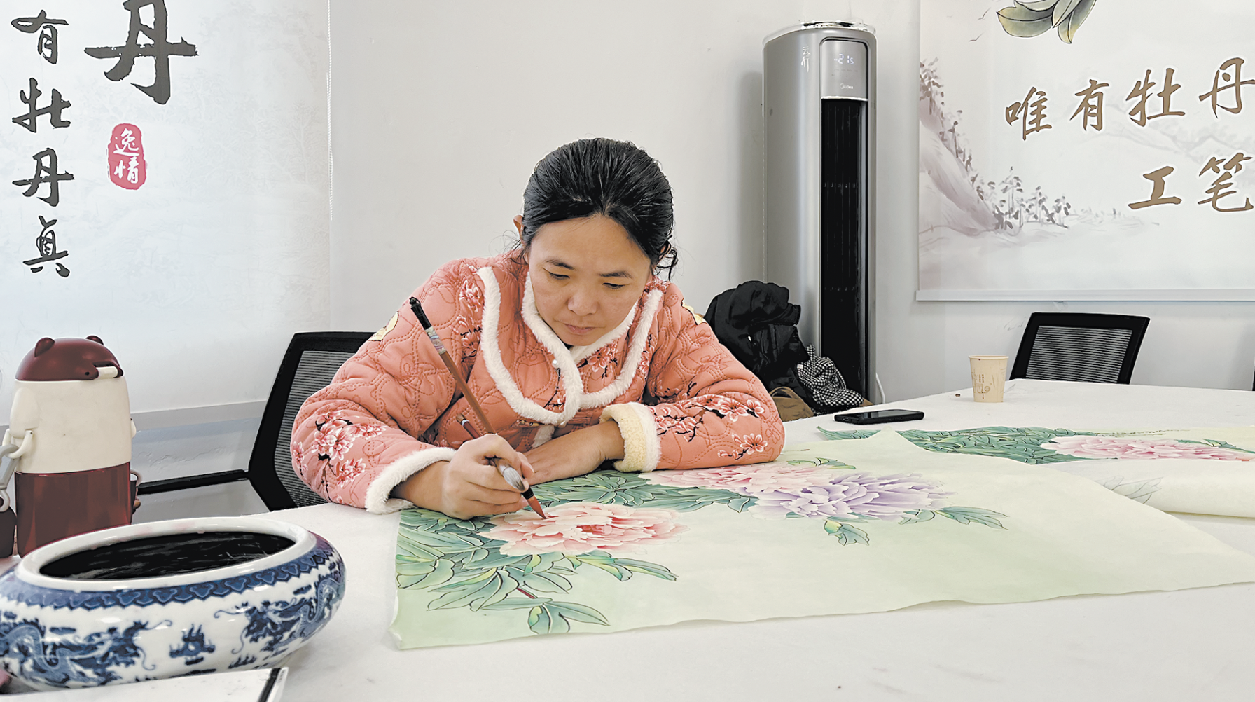 12月20日,巨野縣田橋鎮柏杏書畫院,村民正在繪制工筆牡丹畫。據了解,為進一步拓寬群眾的增收渠道,當地通過開展特色技能培訓,吸納周邊群眾利用閑暇時間在此學習工筆畫,提升群眾的致富本領。