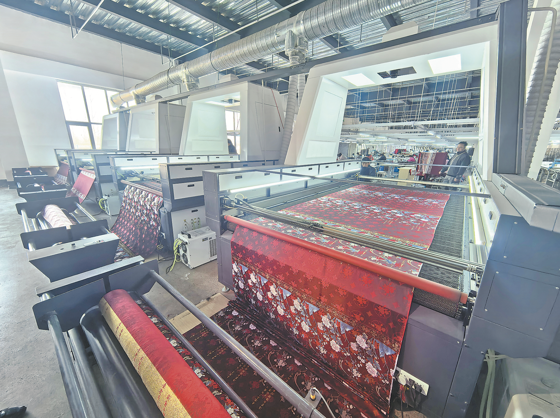2月18日,曹縣有愛共同創業直播基地服飾加工車間,全自動提花機正在生產馬面裙面料。據悉,該基地通過智能化改造,引進了日產萬條馬面裙的卡奧斯智能漢服生產線,漢服生產效率提高50%,人員用工減少30%,有效帶動了曹縣漢服產業高質量發展。